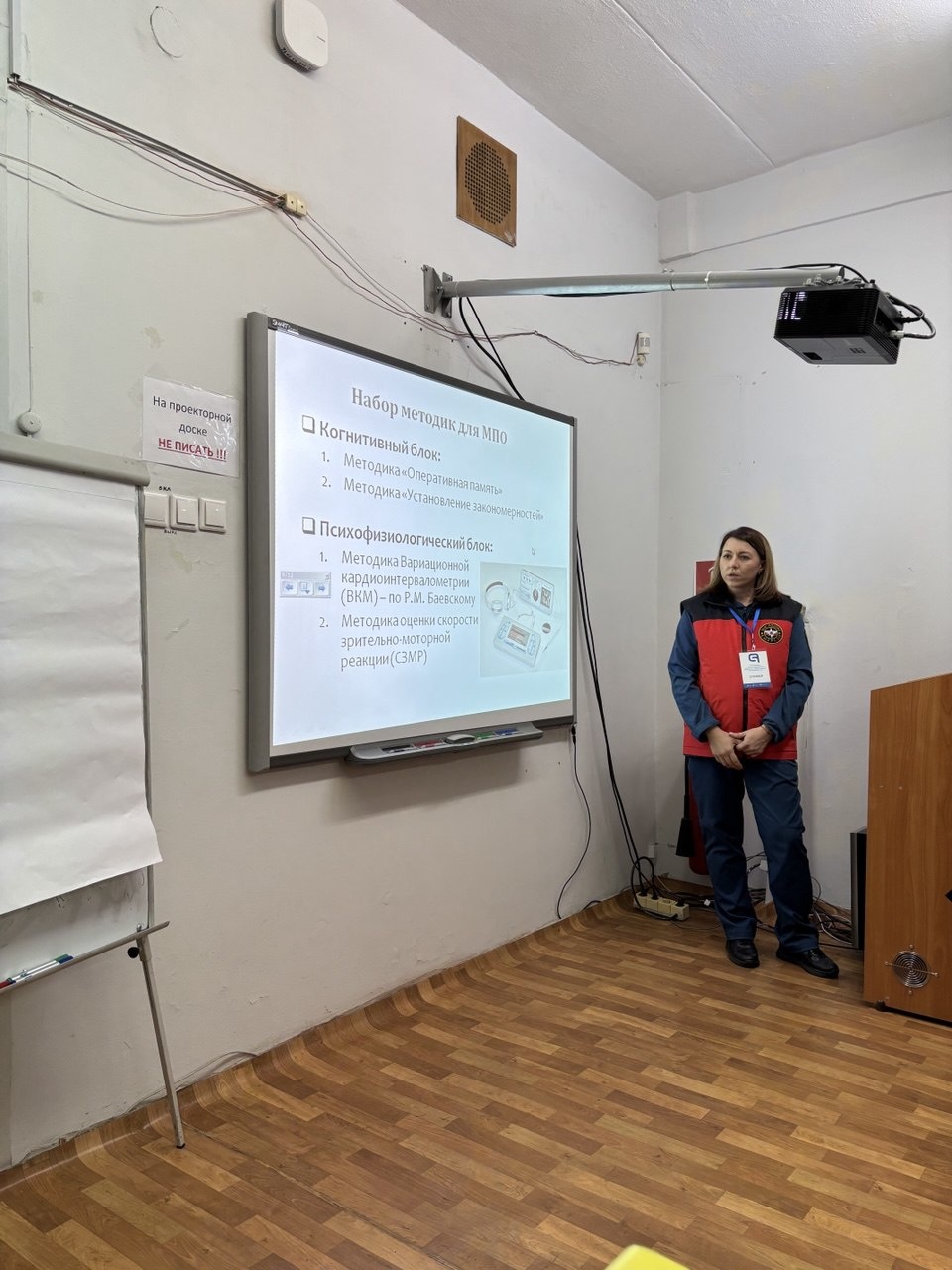 Старший научный сотрудник научно-исследовательского отдела медико-психологической реабилитации Екатерина Юрьевна Каханова подробно рассказала о роли психологической профилактики и коррекции в сохранении профессионального здоровья сотрудников МЧС России, подчеркнув важность превентивных мер и восстановительных техник, показала особенности и принципы действия оборудования с биологической обратной связью