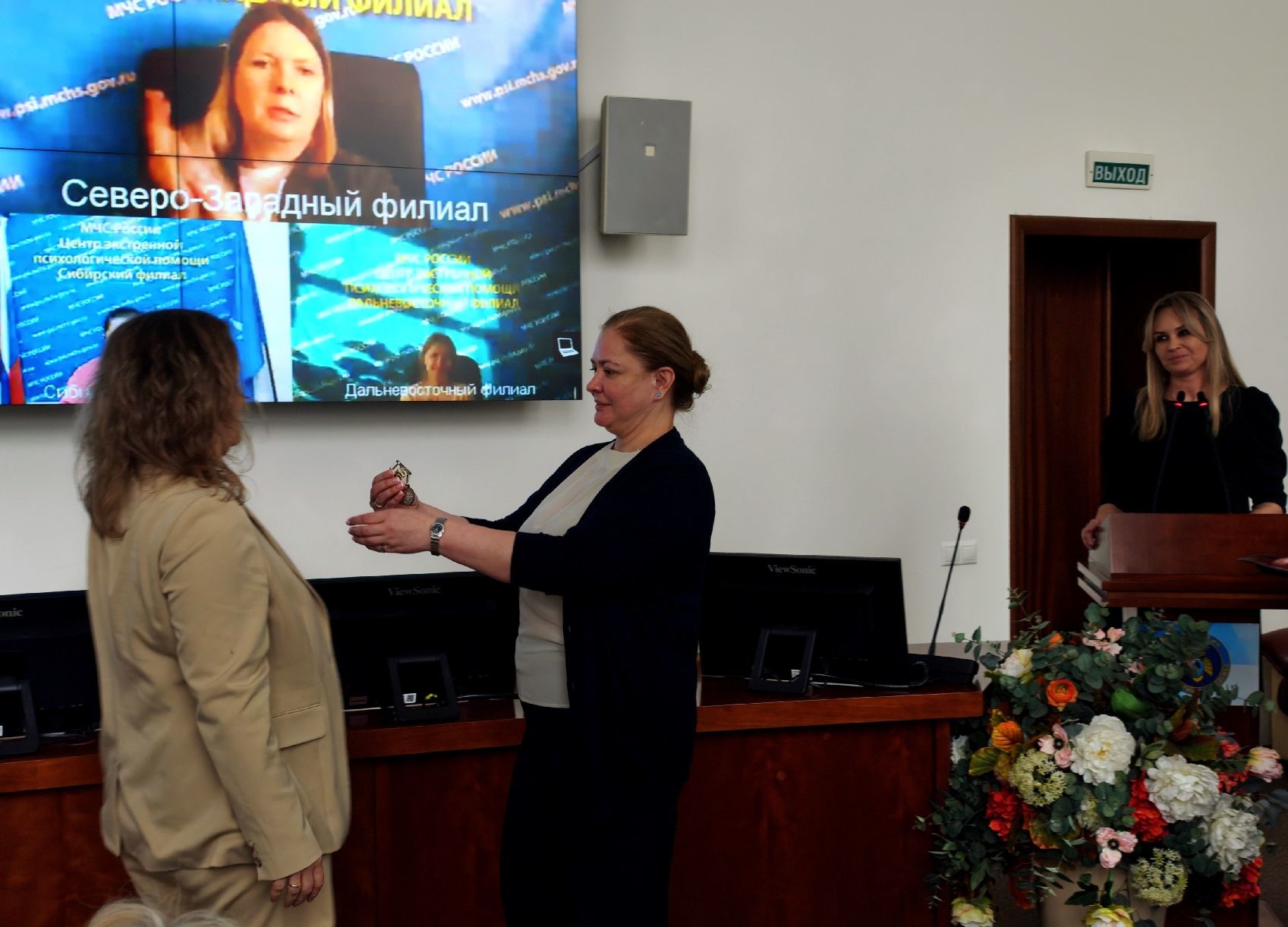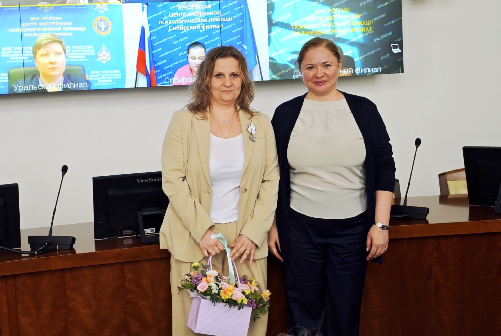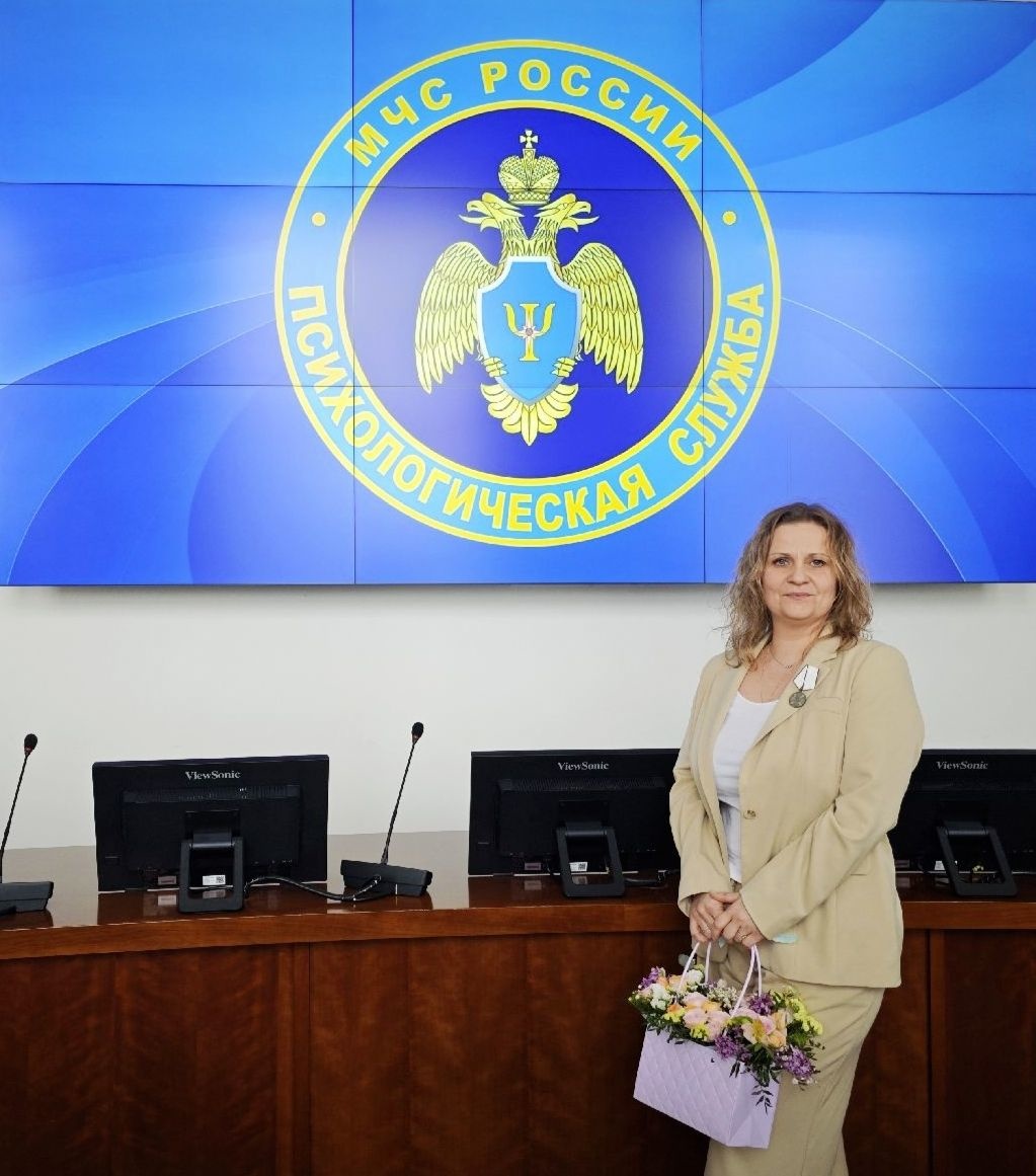 В Центре экстренной психологической помощи МЧС России состоялось торжественное награждение заместителя начальника научно-исследовательского отдела психологической подготовки Анны Соколовой государственной наградой Российской Федерации. За мужество и отвагу, проявленные при исполнении служебного долга в экстремальных условиях, она награждена медалью «За спасение погибавших».