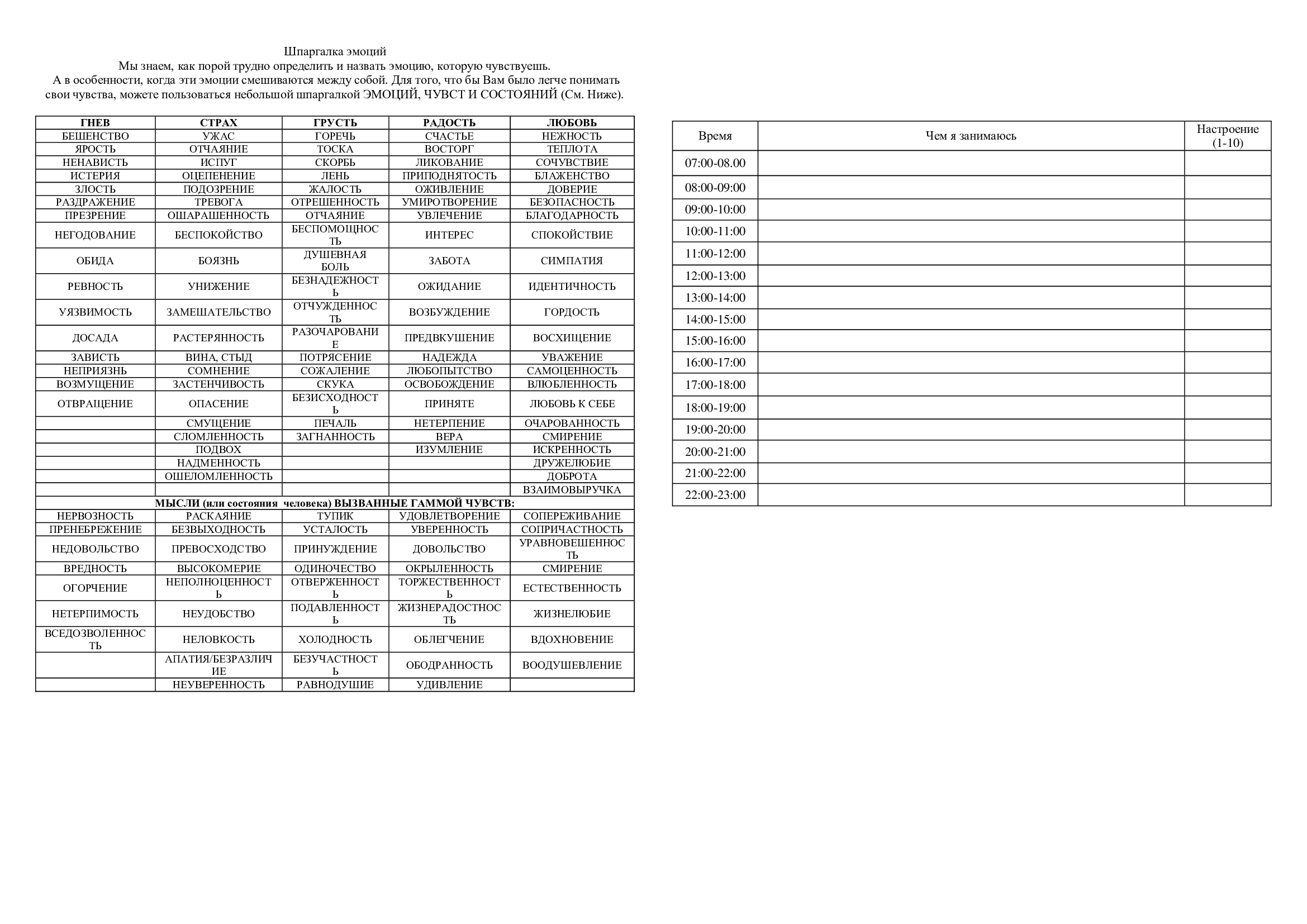 Порой не просто определить и назвать эмоцию, которую чувствуешь. А в особенности, когда эти эмоции смешиваются между собой, либо присутствует ощущение будто ничего не чувствуешь. Для того, что бы Вам было легче понимать свои чувства, можете пользоваться небольшой шпаргалкой.